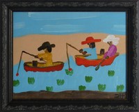 19 - CLEMENTINE HUNTER 'FISHING ON CANE RIVER' OIL Oil painting on canvas depicting three figures in boats fishing on Cane River attributed to Clementine Hunter. Signed lower right. Holds label to verso. Viewable measures 9 3/4" x 7 1/2". Frame measures 12" x 9 1/2" x 1 1/4".