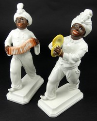 25 - 2pc ROSENTHAL MEISEL BLACKAMOOR PORCELAIN FIGURES Two Rosenthal Meisel Blackamoor porcelain musician figurines. One with accordion and one with cymbals. Each marked to underside and measures approx 7 1/2" x 4" x 2 1/4".