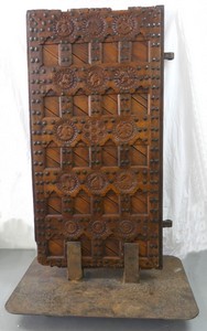 38 - LARGE ANTIQUE WOODEN DOOR w MEDALLIONS & STUDS Large antique wooden door. Decorated with fifteen medallions and metal studs. Mounted for display. Door with hardware measures 70" x 39" x 3 1/4". Base measures 43 1/4" x 31" x 15".