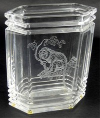 46 - LYNN CHASE CUT CRYSTAL ETCHED MONKEY VASE Lynn Chase for Riedel cut crystal vase of flattened hexagonal form depicting a monkey on tree branch. Signed Lynn Chase and dated 1992. Marked Riedel to underside. Measures 7 1/4" h x 5 1/2" x 2".