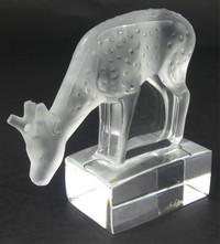 49 - LALIQUE CRYSTAL DEER FAWN PAPERWEIGHT Lalique frosted crystal paperweight in the form of a deer. Signed to side of base. Measures 3 1/4" x 3 1/4" x 1 1/2".