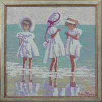5 - HENRY BENSON 'CHILDREN ON BEACH' OIL ON CANVAS Henry Benson (American, 1930-1998) rough textured impressionistic oil painting on canvas. Signed lower right. Viewable measures 35 1/2" x 35 1/4". Frame measures 40 1/2" x 40 1/2" x 1 1/2".